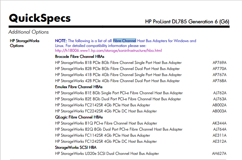 Alternatively, search for the server’s QuickSpecs. After opening the PDF, look for fibre channel. This PDF will list the HBA cards that Hewlett Packard Enterprise is selling to use with this server